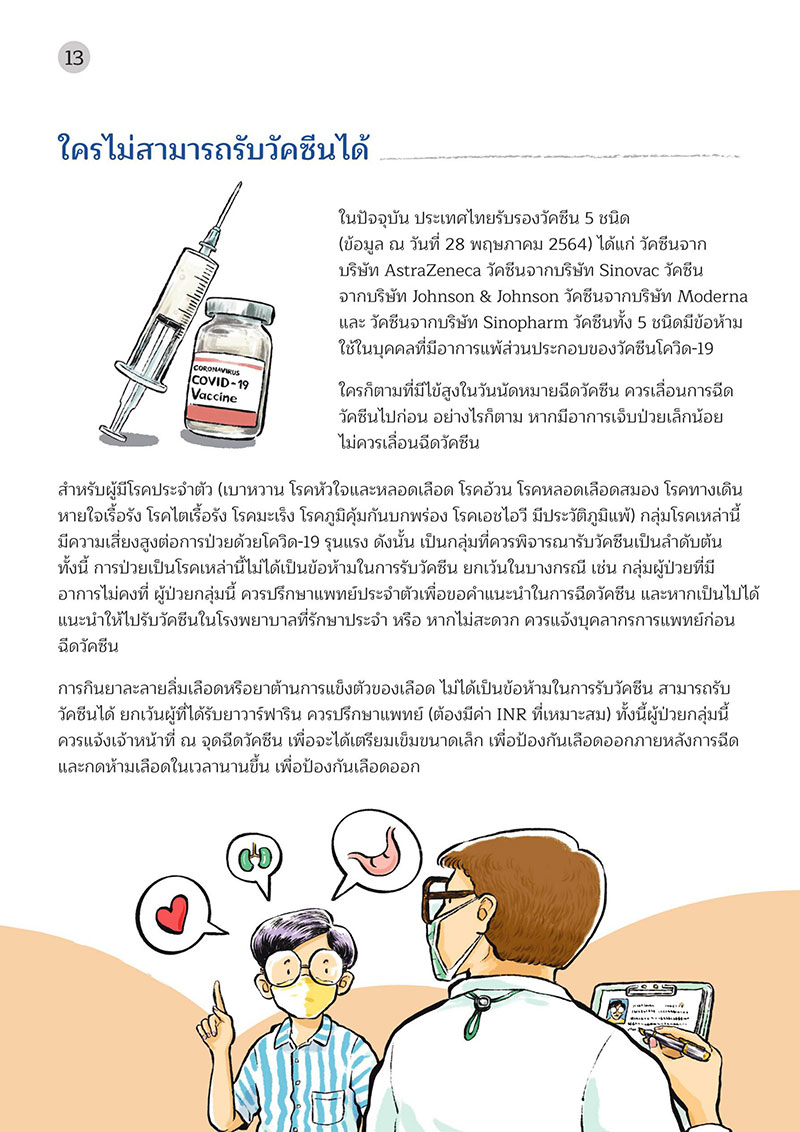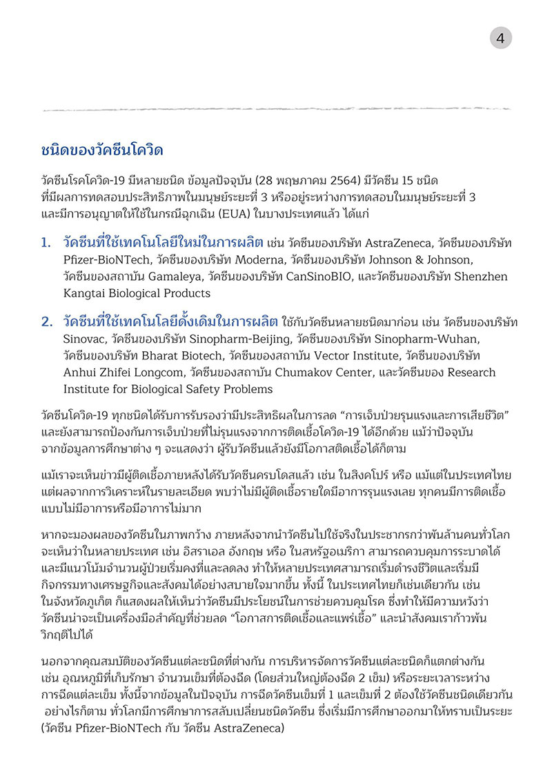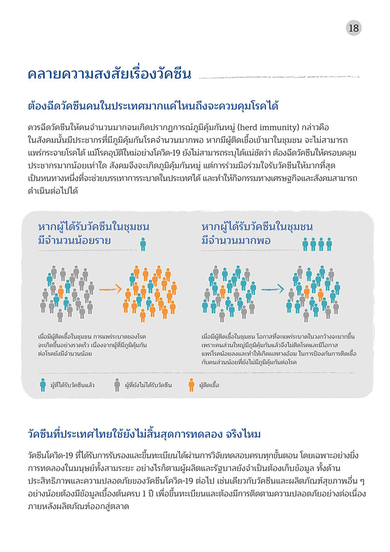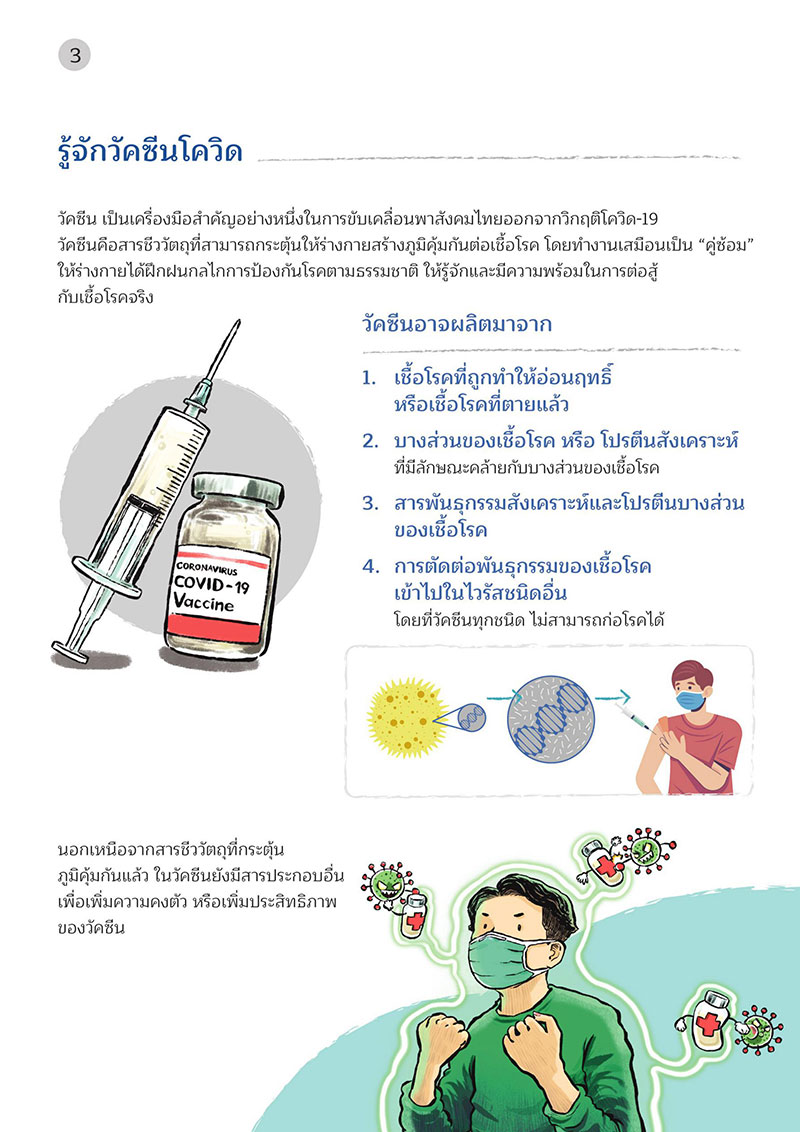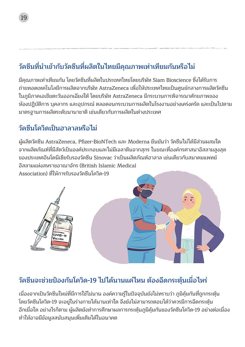 รู้จักวัคซีนโควิด วัคซีนมีกี่ชนิด วัคซีนทำงานอย่างไร วัคซีนต่างชนิดมีประสิทธิภาพและความปลอดภัยต่างกันหรือไม่ ฉีดวัคซีนแล้ว ยังมีโอกาสติดเชือและแพร่เชื้อ ใครควรได้รับวัคซีน และใครไม่สามารถรับวัคซีนได้ อาการไม่พึงประสงค์หลังการฉีดวัคซีน ข้อปฏิบัติก่อน-ระหว่าง-และหลังการรับวัคซีน วัคซีนโควิดเป็นฮาลาลหรือไม่ วัคซีนจะช่วยป้องกนโควิด19 ไปได้นานแไหน ต้องฉีดกระตุ้นเมื่อใหร่ – ข้อมูลความรู้จาก สสส – คู่มือ วัคซีนสู้โควิด (ฉบับประชาชน)